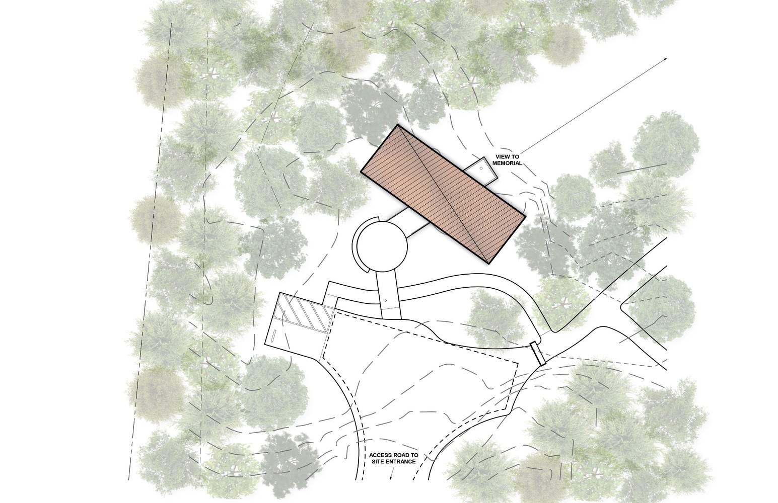 走过边界,访客进入了纪念林。起初被用于伐木的旧木栈道定义了通过森林的主路,而支路将引导人们进入更加私密的空间。小径和开口的网络在护林员和当地工人知识的引导下,随着地面的起伏流动,最终到达一个可以远眺大海和地平线美景的山丘顶部。