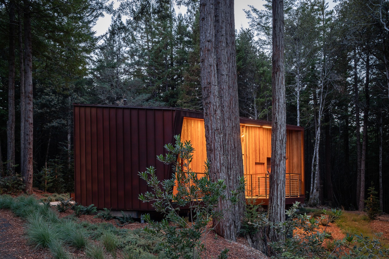 在瞬息万变的森林中,访客中心的物质性表现出一种令人安心的永恒感―它将一直坐落在这里。“内”表面的饰面,外部饰面和天花板都由本地砍伐,干燥和打磨的红杉木制成。深色的折叠考顿钢(Corten Steel)屋顶遮蔽并保护建筑。考顿钢和红杉木表面会随着自然环境的磨砺而变化。仔细定位的红杉木格栅在为玻璃立面的会议室提供私密性的同时,也捕捉着外面的景色